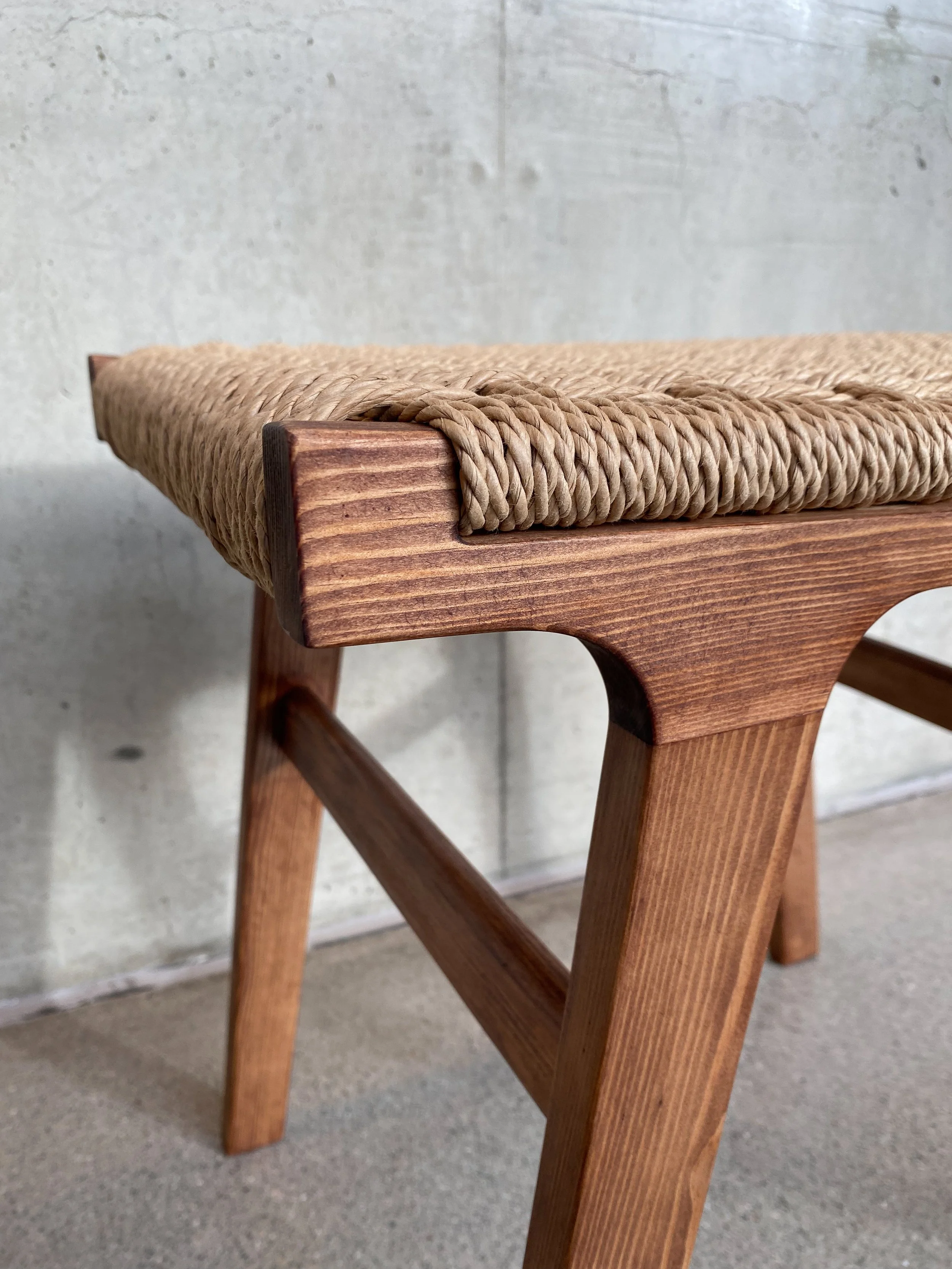 Krakk laget etter forutsetningen av en stokk furu og krav om at det skal være en menneskebærende konstruksjon. Setet er flettet med dansk papircord og mørkbeiset.